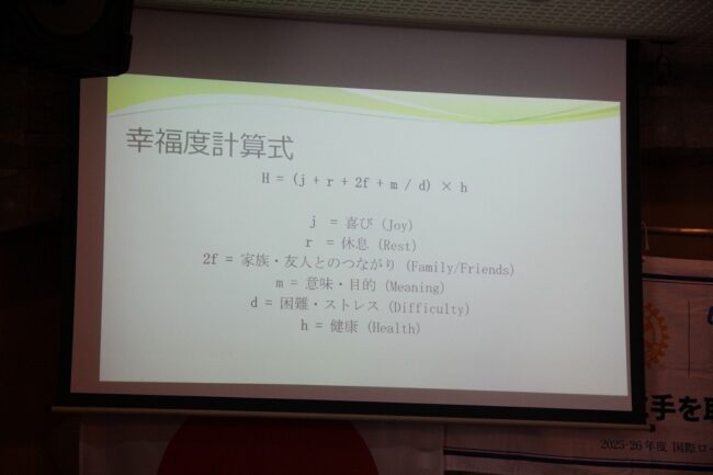 幸福度の計算式や、それを会社やロータリーに当てはめてのお話は大変興味深いものでした。