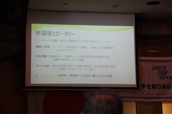 ロータリー情報委員会の菊地委員長からは、「幸福度」とロータリーについて話してもらいました。